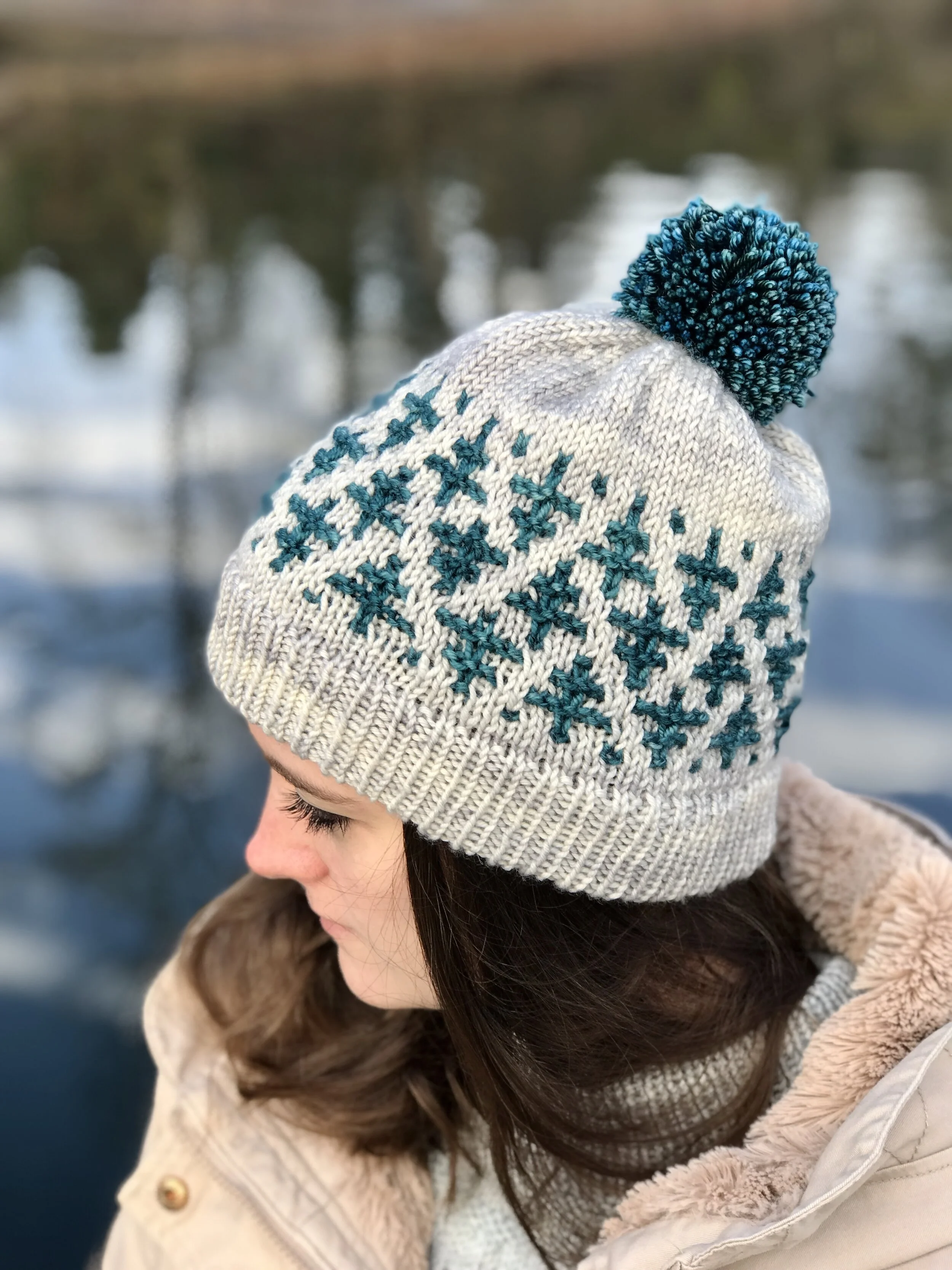 The colorwork on Puget Sound is worked using only one color on any given round. This is a great introduction to easy colorwork without the hassle of carrying two strands of yarn at once. The hat can be made with or without a pom pom.